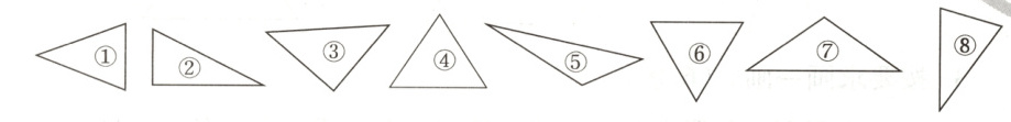 2. 下面三角形中,等腰三角形有( ),等边三角形有( ),锐角三角形有( ),直角三角形有( ),钝角三角形有( )。