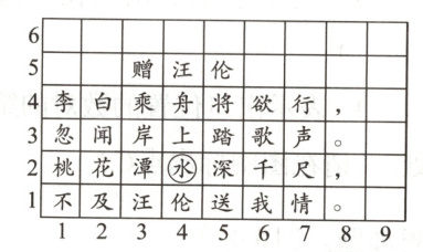 3.(1)右边这首诗是唐代诗人李白的《赠汪伦》,如果图中“水”字的位置用数对(4,2)表示,那么请你用数对分别表示下面这些字的位置。