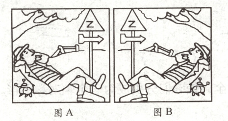 图B是图A在镜子中的影像,但有四个地方画错了,请你找出来。