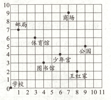 2. 周日,王红的活动路线是(8,2)→(6,4)→(4,3)→(3,6)→(1,7)→(7,9)→(9,5)→(8,2),按顺序说一说她这一天先后去了哪些地方。