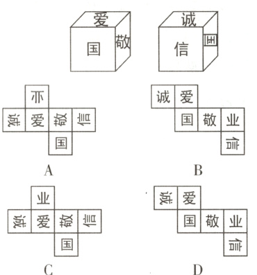 1.小丽把社会主义核心价值观中的“爱国”“敬业”“诚信”写在一个正方体的六个面上,下图是它的两种摆放形式。该正方体展开图有可能是( )。