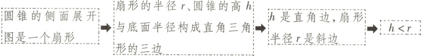 例1 右图扇形的半径是$r$,请你想象,用这个扇形围成一个高为$h$的圆锥(接缝处不计)。圆锥的高$h$与扇形半径$r$之间的关系是( )。