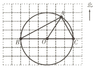 3. 下图中直角三角形的斜边$BC$是圆的直径,$O$是圆心,$AO$ $=$ $AC$。如果每个小方格表示边长为$1cm$的小正方形,那么$A$点在$O$点的( )偏( $)60°$方向( $)cm$处。