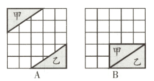 4. 如图,在5×5的方格纸中,将图$A$中的三角形甲平移到图$B$中所示的位置,与三角形乙拼成一个长方形,那么下面的平移方法中,正确的是( )。
