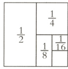 【点拨】这一题可以分步通分,分步求出和,也可以一次性通分再求和。但这里面隐藏了一个规律。$\frac{1}{2}$、$\frac{1}{4}$、$\frac{1}{8}$和$\frac{1}{16}$都是依次减少一半。不妨借助于一个正方形(如右图)来看,它们加起来的和等于整数“1”减去$\frac{1}{16}$。所以本题的结果可以用$1-\frac{1}{16}$来计算。