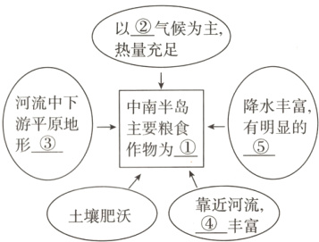 (2)水稻 热带季风 平坦 水源 旱、雨两季