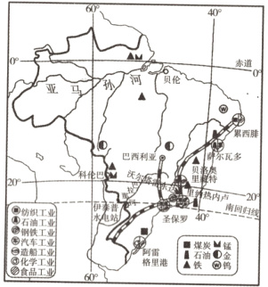 读巴西矿产和工业分布图,回答12~13题。