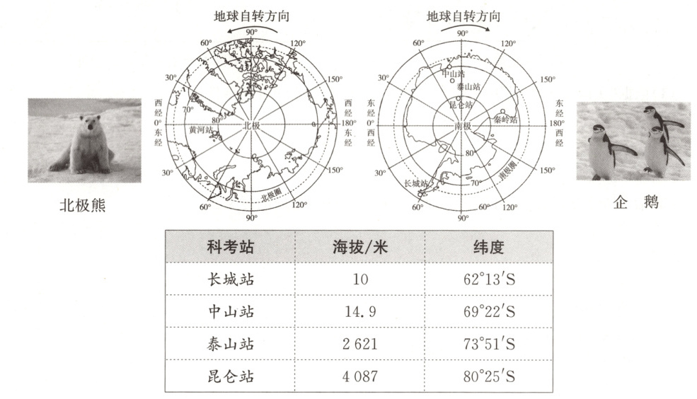 25. (10分)近些年,极地旅游日益受到追捧。下面为两极地区简图和南极地区科考站的海拔与纬度数据。读图表,回答下列问题。