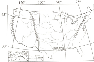 @@C [解析]美国本土中部是地势低平的平原,来自北部的冷空气无高大山脉阻挡,可直达新奥尔良。故选C。