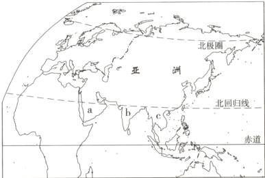 D [解析]读图可知,a是阿拉伯半岛,该半岛上沙漠广布,A项错误;b是印度半岛,沙漠面积小,B项错误;c是中南半岛,山河相间、纵列分布,盛产热带水果,C项错误;三个半岛都被北回归线穿过,D项正确。