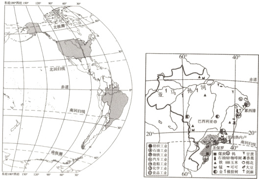 @@A [解析]美国实现了农业地区专门化,农业发达,农用地面积大,产量高,机械化和商品化程度高;巴西的农业主要分布在东南沿海地区,热量充足,以热带经济作物为主。
