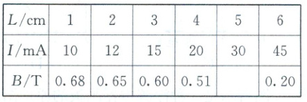 (3)闭合S₁和S₂,图乙中滑动变阻器的滑片P保持不变,将磁敏电阻R水平向左逐渐远离电磁铁时,小超将测出的磁敏电阻与电磁铁左端的距离L、对应的电流表示数I及算出的磁感应强度B同时记录在下表中. 请计算当L=5 cm时,磁敏电阻R所在位置的磁感应强度B=________T.