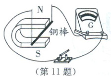 11 如图所示是探究感应电流产生条件的实验装置,磁体和铜棒均水平放置,闭合开关,当铜棒水平向右运动时,小量程电流表G的指针向右偏转,为使电流表指针向左偏转,下列方法可行的是( ).