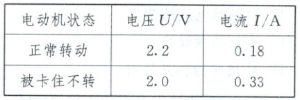 (3)小明按图丙电路将电动机模型连入电路,闭合开关,电动机正常转动,小明记下了电流表和电压表的示数. 实验过程中,由于弧形铁片螺丝松动,电动机线圈被弧形铁片卡住了,小明惊奇地发现,电动机线圈被卡住后,电流表和电压表的示数都发生了变化,小明快速记下了两表的示数(如表所示)并断开了开关.
