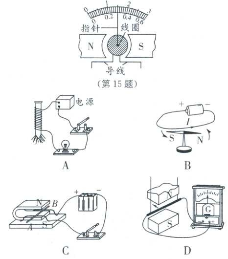 15.C [解析]电流表是根据通电导体在磁场中受力运动的原理制成的.图A探究影响电磁铁磁性强弱的因素;图B探究电流的磁效应;图C探究通电导体在磁场中受力运动;图D探究电磁感应现象.故选C.
