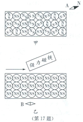 17 把普通钢棒磁化有多种方法,可以用强力磁铁来磁化. 钢棒是由大量的原子组成,每个原子都有N、S极,相当于一个磁性很弱的“小磁铁”. 未被磁化前,钢棒内“小磁铁”的排列杂乱无章,此时钢棒对外不显磁性. 用一个强力条形磁铁按图中的箭头方向滑动,钢棒就被磁化,磁化后各个“小磁铁”按图所示同向排列,钢棒具有磁性,相当于条形磁铁. 下列说法正确的是( ).