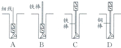 16 在一次课外实验活动中,一颗铁质的小螺丝掉入细小狭长的小洞中. 小科设计了以下四种方案,其中不能取出小螺丝的是( ).
