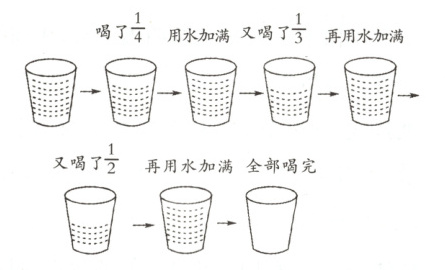$\frac{1}{4}$ + $\frac{1}{3}$ + $\frac{1}{2}$ = 1$\frac{1}{12}$(杯) 答: 明明喝了 1$\frac{1}{12}$杯水。