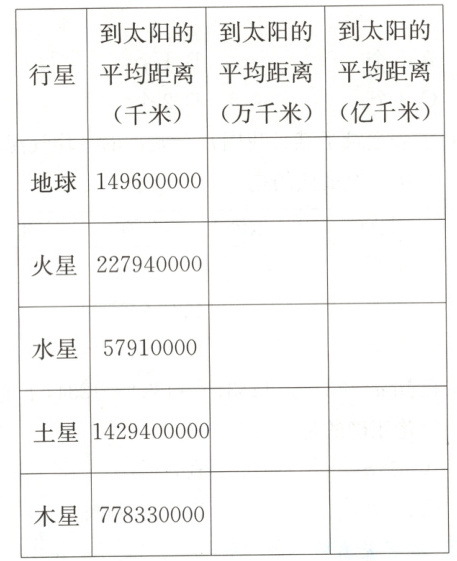 2. 下面是一些行星到太阳的平均距离。先改写成用“万”作单位的数,再四舍五入到亿位。(10分)
