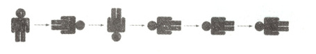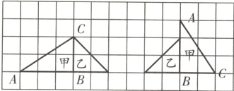 甲三角形先向右平移 6 格,再绕 B 点沿顺时针方向旋转 90°;乙三角形先向右平移 6 格,再绕 B 点沿逆时针方向旋转 90°,就可和右图完全重合。