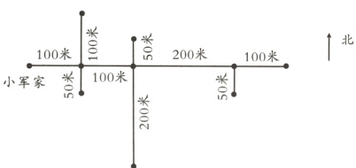 小军:从我家出来,向东一直走500米可以到达学校,在这途中,还有许多地方。从家出门向东走100米是个十字路口,若向北走100米就到了书店,若向南走50米,就到了邮局。从家出来向东走200米后,若向北走50米有花市,若向南走200米有动物园。从学校出来向西走100米是体育场,再向南走50米有超市。