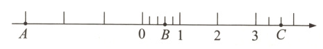 3. 在下面的数轴上,点A表示的数是 ( ),点B表示的数写成小数形式是 ( ),点C表示的数用分数表示是$\frac{( )}{( )}$。