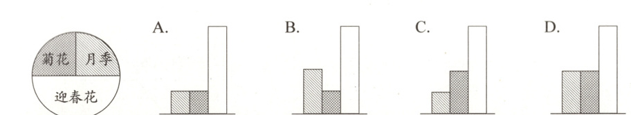$2. $一个圆形花坛内种了三种花,其面积的占比情况如图所示。用条形图表示各种花的占地面积之间的关系,正确的是$( )。$