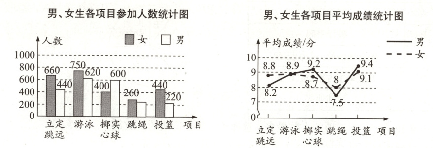 立定跳远、游泳、跳绳项目男、女生的平均分均小于9分,投篮项目男、女生的平均分大于9分,故该地区上届六年级学生的考试项目中达到“优秀”的有掷实心球项目和投篮项目。
