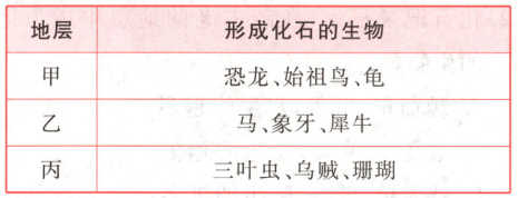 (2) 分析材料一表格可知,__________(填“甲”“乙”或“丙”)地层地质年代最远,因为该地层中形成化石的动物都比较__________(填“低等”或“高等”)。