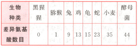 材料二 通过测定并比较各种生物的细胞色素 c 的化学结构,发现其序列很相似,但也有差别。下表是几种生物与人的细胞色素 c 不同的氨基酸数目,这种结构上的差异程度又恰好与它们的亲缘关系远近相对应。