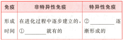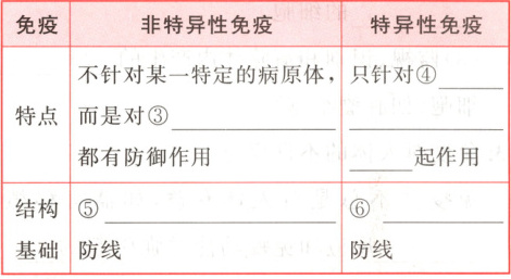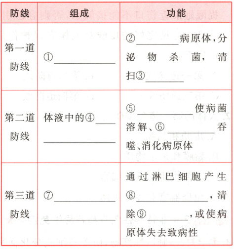 一、1. ①皮肤和黏膜 ②阻挡 ③异物 ④杀菌物质和吞噬细胞 ⑤溶菌酶 ⑥吞噬细胞 ⑦免疫器官和免疫细胞 ⑧抗体 ⑨抗原 2. ①生来 ②出生后 ③多种病原体 ④某一特定的病原体或异物 ⑤第一道和第二道 ⑥第三道 3.