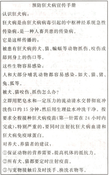 $10.(2024·$滨州中考)狂犬病是一种烈性传染病。大力普及狂犬病知识,懂得如何预防狂犬病非常重要。某生物兴趣小组经过查找资料,制作了如下宣传手册。回答相关问题。