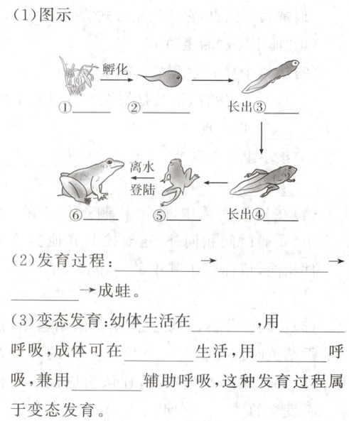 1. 两栖动物的生殖和幼体的发育必须在______进行,幼体要经过______才能上陆地生活。