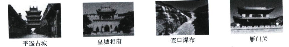 5.在暑假到来之际,李强计划从平遥古城、皇城相府、壶口瀑布、雁门关四个旅游景点中任意选择一个去游玩.如图,他将这四个旅游景点的图片制作成四张卡片(除内容外,其余完全相同),并将这四张卡片背面朝上,洗匀后随机抽取一张,恰好抽到壶口瀑布的概率为 ( )
