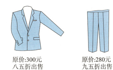 (2)爸爸去同一家超市挑选了一件西装上衣与一条裤子(如图所示)。明明心里想:两件一起买就是打九折。你觉得明明的想法对吗?请说明理由。
