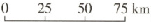 改写成数值比例尺是( ),若在该图上量得A、B两地间的距离是2.4 cm,则A、B两地间的实际距离是( )km。