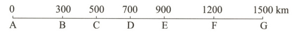 上图是某高铁从A站到G站及中途各停靠点的线路图,全程票价是600元。刑警发现一名嫌疑人从D站上车,票价200元,刑警推断该嫌疑人在( )站下车。