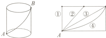(2)右图是左图的侧面展开图。一只蚂蚁沿着圆柱的侧面,从点A沿着最短距离爬到点B。蚂蚁的爬行路线是( )。(填序号)