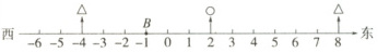 (4)配送服务机器人从0处出发,先走了−3m,然后走了+4m,最后走了−2m,到达点B。请在直线上标出点B的位置。