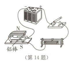 14. (2022·无锡中考)如图所示的实验中,闭合开关,观察到铝棒向左运动,实验现象说明磁场对____________有力的作用,利用这一原理可以制成________机;断开开关,对调电源正、负两极,重新接入电路,再次闭合开关,观察到铝棒向________运动。
