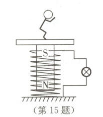 15. (2023·无锡中考)某幼儿园游乐室里有一块能发电的地板,当小朋友们在上面跳跃时,小灯泡便会一闪一闪。地板下方铺设的结构如图所示。当踩踏地板进行跳跃时,固定在地板下方的磁铁往复运动,使固定在地面上的弹簧线圈做________磁感线运动,闭合电路中产生____________,使得小灯泡发光。
