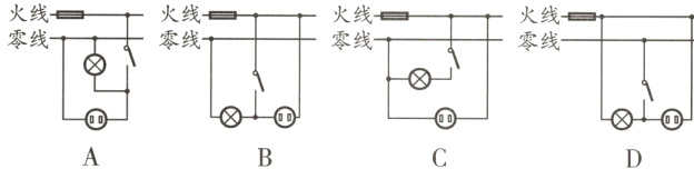 3. 小明家书房有一盏照明灯,闭合和断开照明灯开关时,照明灯正常发光和熄灭,小明晚上学习时,将一盏完好的台灯(台灯开关始终闭合)插入书房插座后发现:闭合照明灯开关时,发现照明灯亮,台灯不亮;断开照明灯开关时,照明灯和台灯均亮,但亮度不够,为了节约用电,小明在开关断开时取下照明灯,想让台灯单独工作,结果发现台灯也不亮,此时用测电笔测试台灯插座两孔氖管均发光. 则符合他家书房电路实际情况的电路图是(图中电灯为照明灯,开关为照明灯开关,插座为台灯插座)( ).