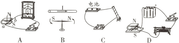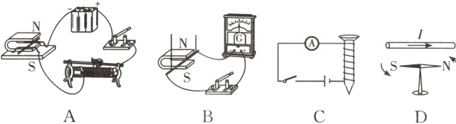 9.超市的商品上贴有磁性标签,当未消磁的标签通过超市门口的安全门时,安全门上的线圈会产生电流触发警报器,达到防盗目的. 图中的实验与超市防盗装置的工作原理相符的是( ).