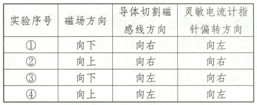 (2)利用此装置.探究感应电流方向与磁场方向和切割磁感线方向之间的关系,观察到的实验现象记录如下: