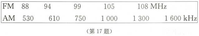 17. 如图是收音机的调台面板,“FM”和“AM”为两个波段,________波段的波长较长;图中“750”字样代表接收电磁波的波长为________m.