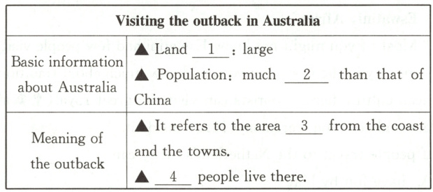 Australia is very big, but not many people live there. In fact, its population is just a little larger than that of Beijing. The outback refers to the area that is a long way from the coast and the towns, where few people live.
