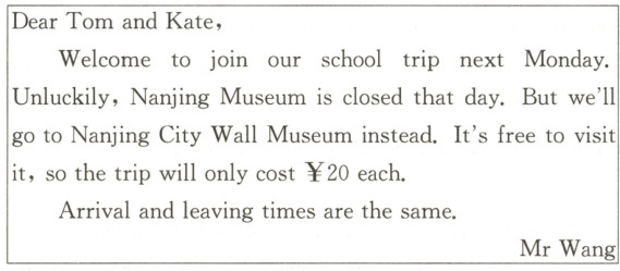 5.A [解析]考查学习技能。句意:根据这个通知,你能得到什么信息?根据“Welcome to join our school trip next Monday... But we'll go to Nanjing City Wall Museum instead.”可知,下周一会进行学校旅行。故选A。