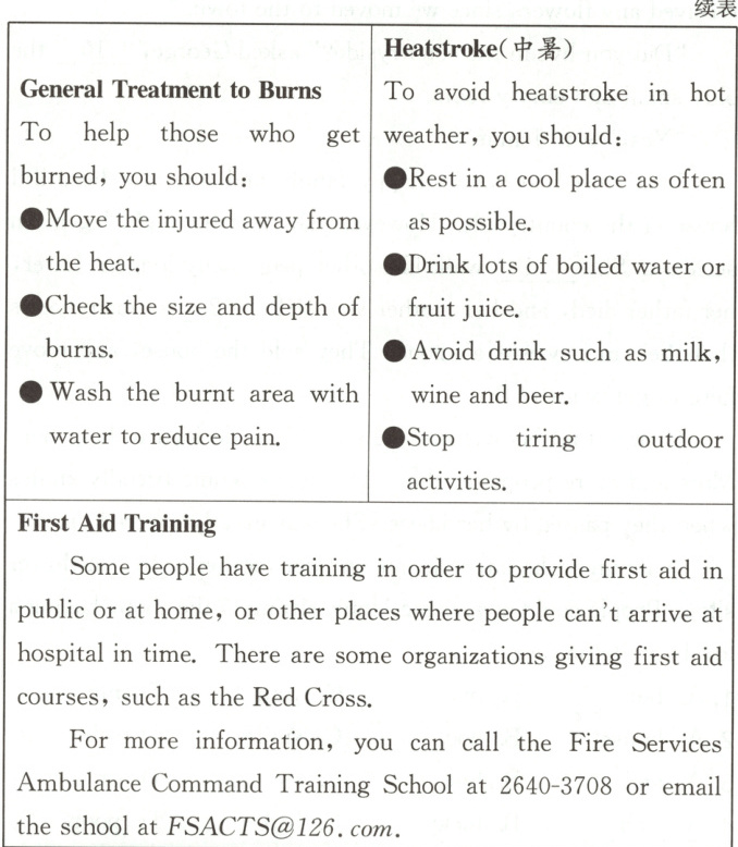 2. C [解析]细节理解题。根据“Check the size and depth of burns.”可知,如果有人胳膊被火烧伤了,应该检查烧伤的大小和深度。C 项符合文意。故选 C。
