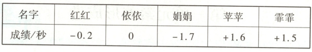 2. 体育课上,五名女生进行了百米跑测试,达标成绩为18秒,少于18秒的成绩用正数表示,超过18秒的成绩用负数表示,成绩如下表。