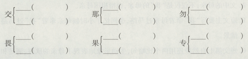 示例:$\begin{cases}绞(绞杀)\\校(学校)\end{cases}$ $\begin{cases}挪(挪移)\\哪(哪里)\end{cases}$ $\begin{cases}吻(口吻)\\忽(忽然)\end{cases}$ $\begin{cases}偎(依偎)\\喂(喂养)\end{cases}$ $\begin{cases}裸(赤裸)\\课(课本)\end{cases}$ $\begin{cases}砖(板砖)\\转(转动)\end{cases}$
